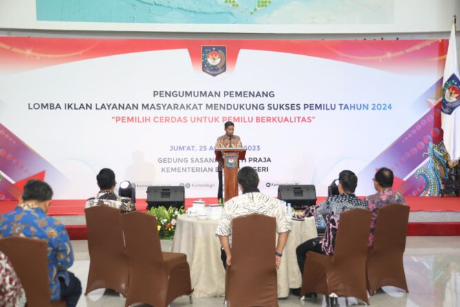 GERBANGPATRIOT.COM – Jakarta, Kementerian Dalam Negeri (Kemendagri) mengumumkan pemenang lomba iklan layanan masyarakat mendukung sukses Pemilu Tahun 2024 dengan tema “Pemilih Cerdas untuk Pemilu Berkualitas”. Acara yang digelar oleh Direktorat Jenderal (Ditjen) Politik dan Pemerintahan Umum (Polpum) Kemendagri tersebut dilaksanakan secara hybrid dari Gedung Sasana Bhakti Praja (SBP) Kantor Pusat Kemendagri, Jakarta, Jumat (25/8/2023).