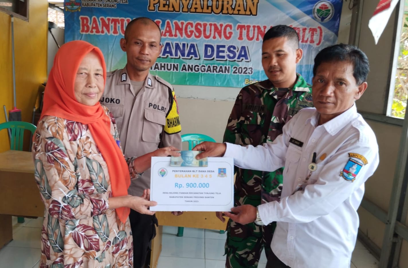 GERBANGPATRIOT.COM – Serang, Untuk memastikan tepat sasaran, Babinsa Koramil 0602-08/Petir Kodim 0602/Serang Sersan Satu (Sertu) Arifin dan Bhabinkamtibmas Polsek Petir Bripka Joko, mendampingi Kepala Desa Bojong Pandan Hulman Spd,i dan memantau langsung kegiatan penyaluran Bantuan Langsung Tunai Dana Desa (BLT DD) Triwulan II (Dua) Tahun 2023, bertempat di Kantor Desa Bojong Pandan Kecamatan Tunjung Teja Kabupaten Serang Provinsi Banten, Kamis, (31/08/2023).