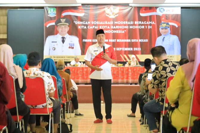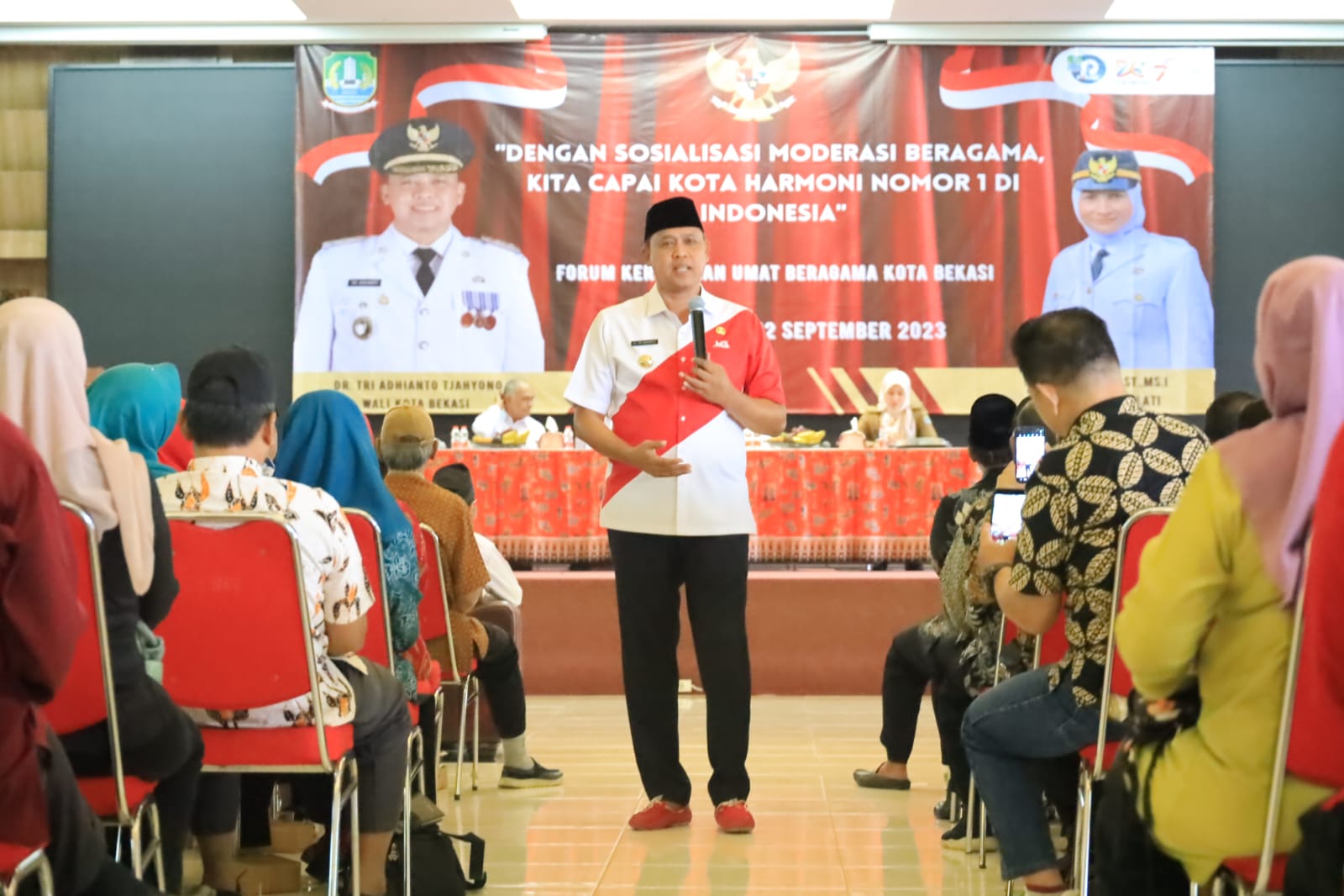 Wali Kota Bekasi, Tri Adhianto bersama Ketua FKUB, Abdul Manan, dan Camat Pondok Melati, Heni Setiowati, hadir langsung dalam sosialisasi tersebut yang mengusung tema Dengan Sosialisasi Moderasi Beragama, Kota Capai Harmoni Nomor 1 di Indonesia.