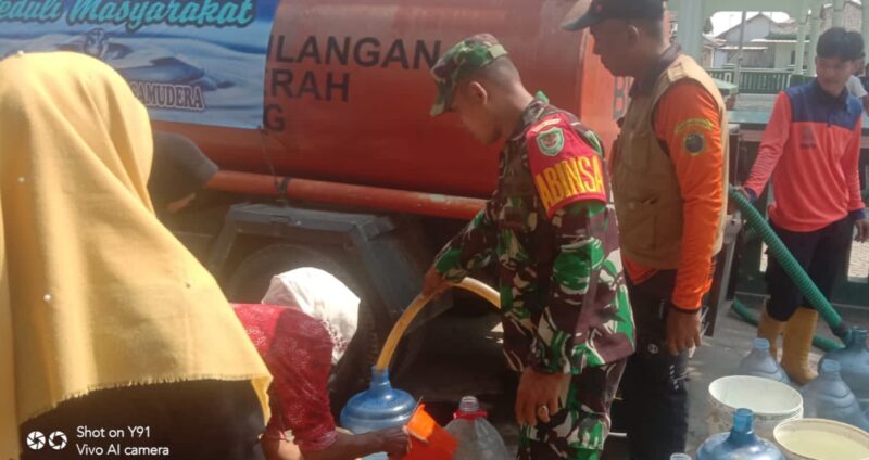 GERBANGPATRIOT.COM – Kota Serang, Bintara Pembina Desa (Babinsa) Koramil 0602-06/Kasemen Kodim 0602/Serang Kopral Satu (Koptu) Donny, membantu Bandan Penanggulangan Bencana Daerah (BPBD) Provinsi Banten, menyalurkan bantuan pasokan air bersih akibat terjadi kemarau yang disebabkan fenomena El Nino, di Lingkungan Kisalah Tiga Desa Kisalah Kecamatan Kasemen Kota Serang Provinsi Banten, Sabtu (16/09/2023).
