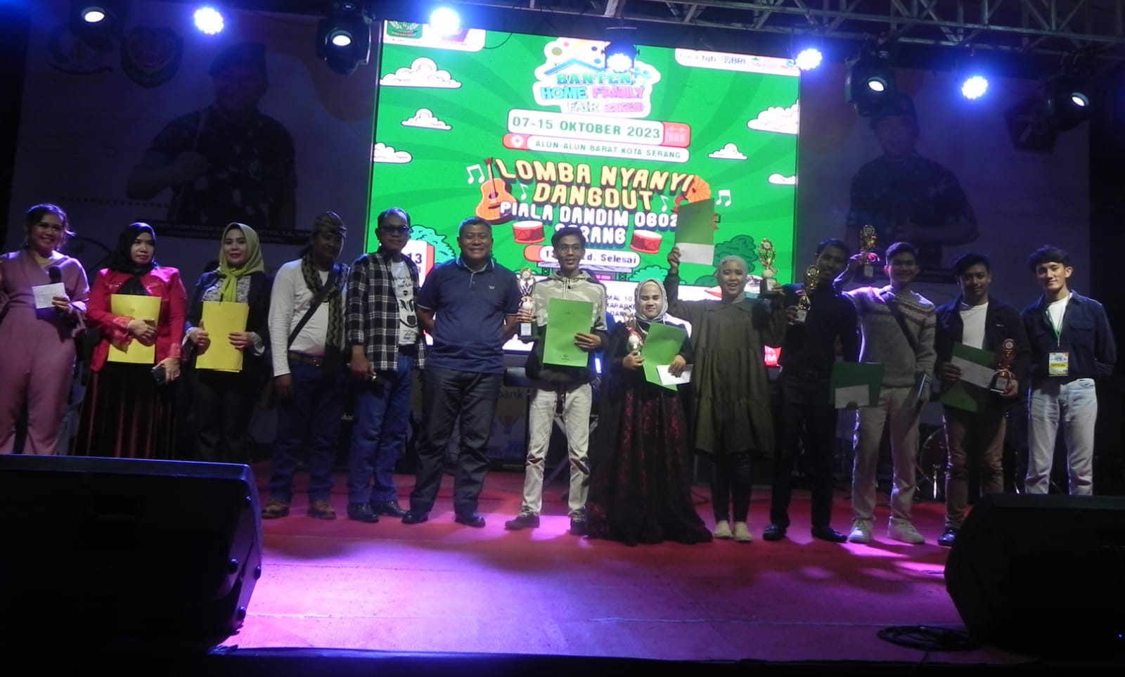 GERBANGPATRIOT.COM – Kota Serang, Komandan Kodim (Dandim) 0602/Serang Kolonel Arm Fajar Catur Prasetyo, S.E., M.M menyerahkan piala dan hadiah, kepada para pemenang lomba nyanyi dangdut Piala Dandim 0602/Serang, dalam rangkaian kegiatan Family Home Fair Tahun 2023 memperingati HUT TNI Ke 78, bertempat di Alun Alun Kota Serang Provinsi Banten, Jum’at Malam (13/10/2023).
