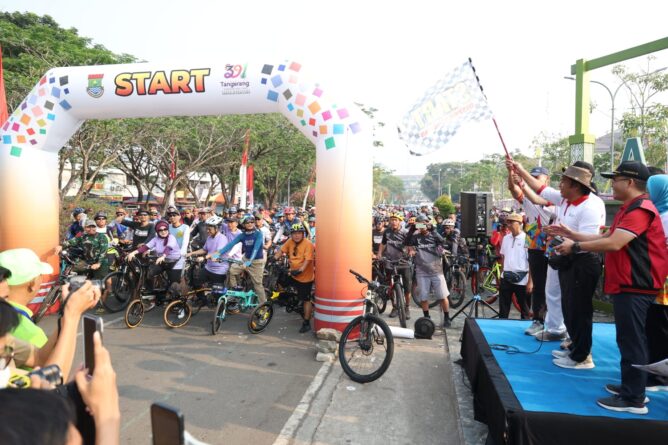 Kegiatan diawali Al Muktabar dengan melepas Fun Bike atau Sepeda Santai 391 Tahun Kabupaten Tangerang di Alun-alun Tigaraksa, Kabupaten Tangerang, Sabtu (14/10/2023). Turut mendampingi pelepasan: Pj Bupati Tangerang Andi Ony Prihartono, Pj Sekda Provinsi Banten Virgojanti, serta Ketua Komisi V DPRD Provinsi Banten Yeremia Mendrofa.