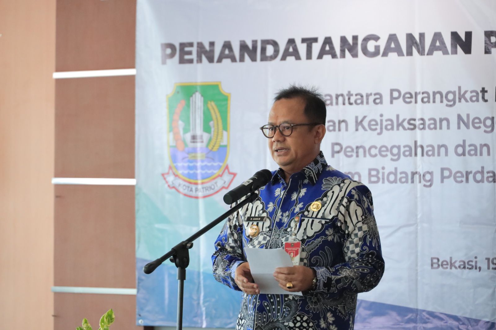 Pj Wali Kota Bekasi Gani Muhamad sampaikan perjanjian kerja sama dapat mengoptimalkan peran serta kejaksaan negeri Kota Bekasi dan perangkat daerah dalam penyelenggaraan tata kelola pemerintahan yang baik serta upaya pencegahan dan penyelesaian permasalahan bidang penanggulangan bencana daerah.