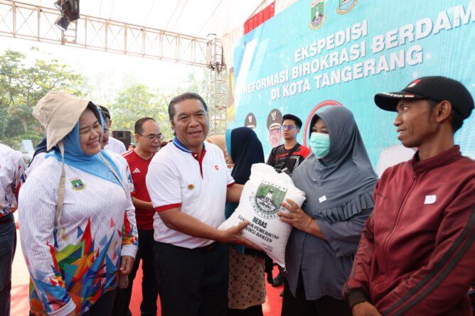 GERBANGPATRIOT.COM – Banten, Pemerintah Provinsi (Pemprov) Banten menggelar Gerakan Pangan Murah dalam kegiatan Ekspedisi Reformasi Birokrasi Tematik Berdampak di Kota Tangerang, pada rangkaian HUT ke-23 Provinsi Banten di Halaman Pusat Pemerintahan Kota Tangerang, Jl. Satria – Sudirman No.1 Kota Tangerang, Minggu (29/10/2023). Tujuannya, untuk pengendalian inflasi.