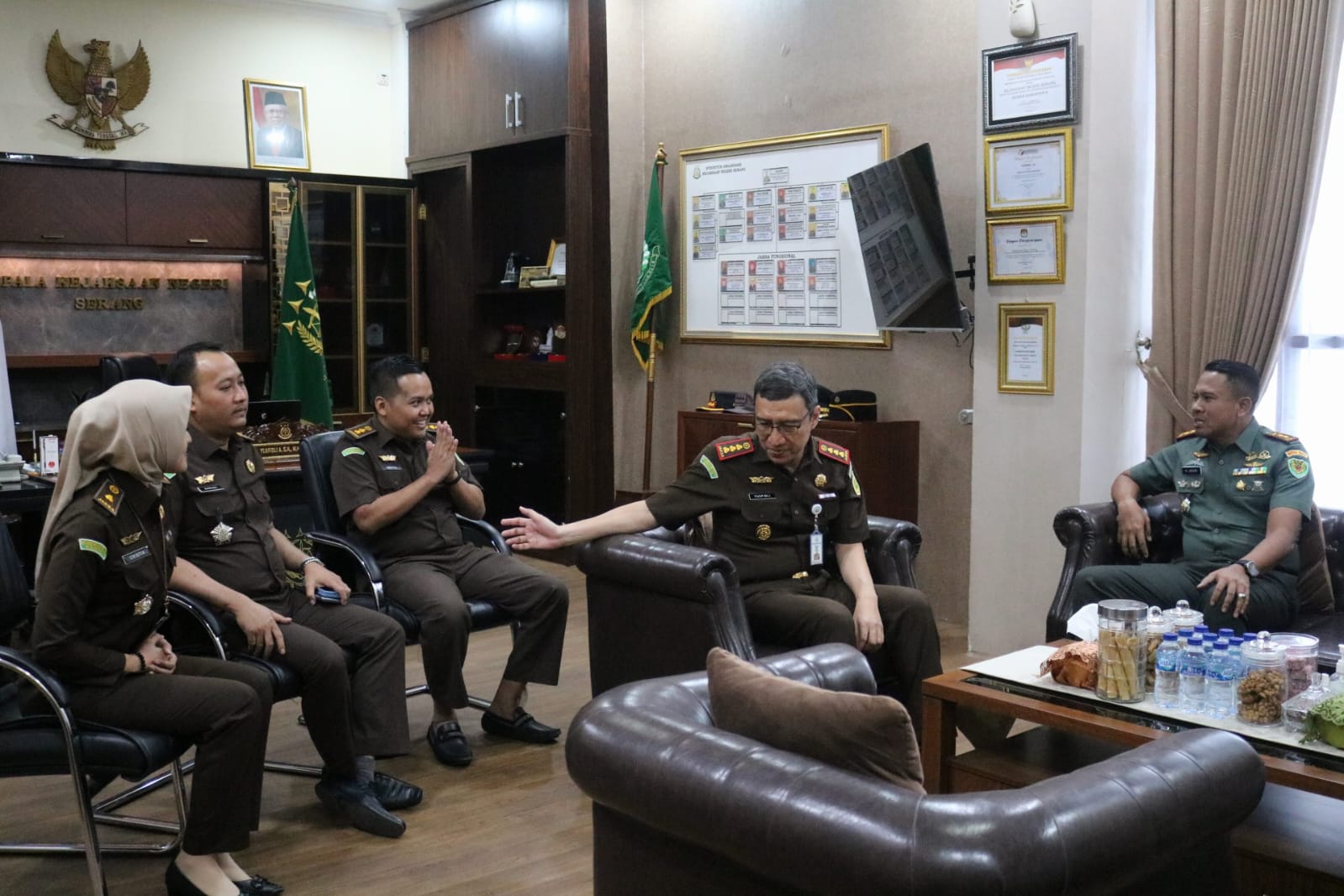 Dikantor Kajari, Dandim 0602/Serang diterima langsung oleh Kajari Muhammad Yusfidlia, SH. MH.LLM beserta staf, di ruang kerjanya.
