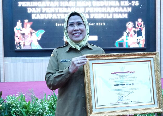 GERBANGPATRIOT.COM – Banten, Pemerintah Kabupaten (Pemkab) Serang kembali menerima penghargaan Kabupaten Peduli Hak Asasi Manusia (HAM) dari Kementerian Hukum dan HAM (Kemenkumham) Republik Indonesia. Penyerahan penghargaan diberikan oleh Penjabat Gubernur Banten Al Muktabar dan diterima langsung Bupati Serang Ratu Tatu Chasanah di Pendopo Gubernur Banten, Senin (11/12/2023).