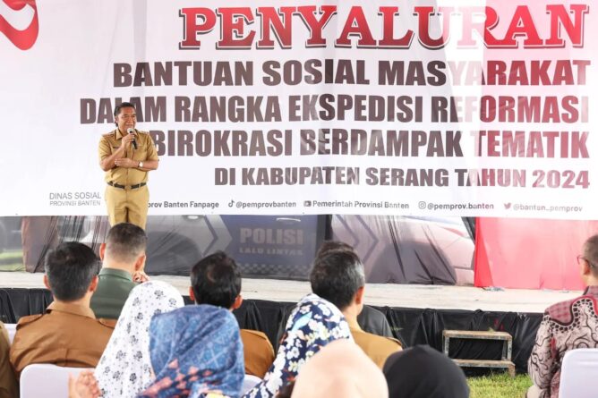 Sebagai informasi, Ekspedisi Reformasi Birokrasi Berdampak Tematik Pemerintah Provinsi Banten disalurkan bantuan kursi roda bagi disabilitas sebanyak 81 unit se Provinsi Banten; Bantuan Tongkat Ketiak bagi disabilitas sebanyak 80 pasang se Provinsi Banten; Bantuan Kaki Palsu bagi disabilitas sebanyak 30 buah se Provinsi Banten; Bantuan Tongkat Kaki Tiga bagi lanjut usia Se-Provinsi Banten sebanyak 200 unit; Bantuan Jaminan Sosial Keluarga dalam rangka penanganan kemiskinan ekstrem se Provinsi Banten 65.000 KK untuk Kab.Serang sebanyak 9.435 KK @ Rp. 500.000; Bantuan Permakanan Susu dan Telur se Provinsi Banten 12.000 penerima mendapatkan 6 Kg Telur dan Susu UHT ukuran 125ml sebanyak 90 buah; Bantuan Usaha Ekonomi Produktif (UEP) se Provinsi Banten 740 penerima untuk Kabupaten Serang 50 penerima; Bantuan Alat Bantu Dengar bagi disabilitas sebanyak 39 pasang se Provinsi Banten; Bantuan Beras untuk Kabupaten Serang sebanyak 3.620 KPM @ 10 Kg; Bantuan makanan bernutrisi untuk anak Stunting sebanyak 425 paket jenis bantuan yang diberikan berupa beras fortifikasi: telur, Susu UHT,Kacang hijau,biskuit regal,gula aren dan minyak goreng; Bantuan pemberdayaan ekonomi perempuan untuk anak perempuan kepala keluarga dan orang tua anak stunting, jenis bantuan yang diberikan oven dan loyang sebanyak 2200 dan chopper sebanyak 385 buah (simbolis 2 orang) 1 Orang Penerima Oven, Loyang dan 1 Orang Penerima Chopper; Bantuan natura untuk perempuan dan anak penyintas kekerasan sebanyak 100 orang berupa beras, kacang hijau, sarden, the celup, susu, minyak goreng dan tepung terigu; Bantuan Benih Padi Kaya Gizi (Bio Fortifikasi) untuk 19 Ha, sebanyak 475 Kg; Bantuan Benih Cabai 6 Pack, Insektisida Karbofuran 3 G @5 Kg, Mulsa Plastik Hitam Perak 4 Roll, Pupuk Organik Granule @250 Kg, NPK 16 @100 Kg, Tsp/SP36 @25 Kg,KCI @25 Kg; Bantuan Ikan Konsumsi sebanyak 100 bag @ 1 Kg; Bantuan Listrik Desa untuk 1000 Rumah Tangga Sasaran; serta Bantuan BPJS Peserta Bukan Penerima upah yang dibiayai oleh Provinsi Banten Kabupaten Serang sebanyak 123.559 jiwa.(Wan)