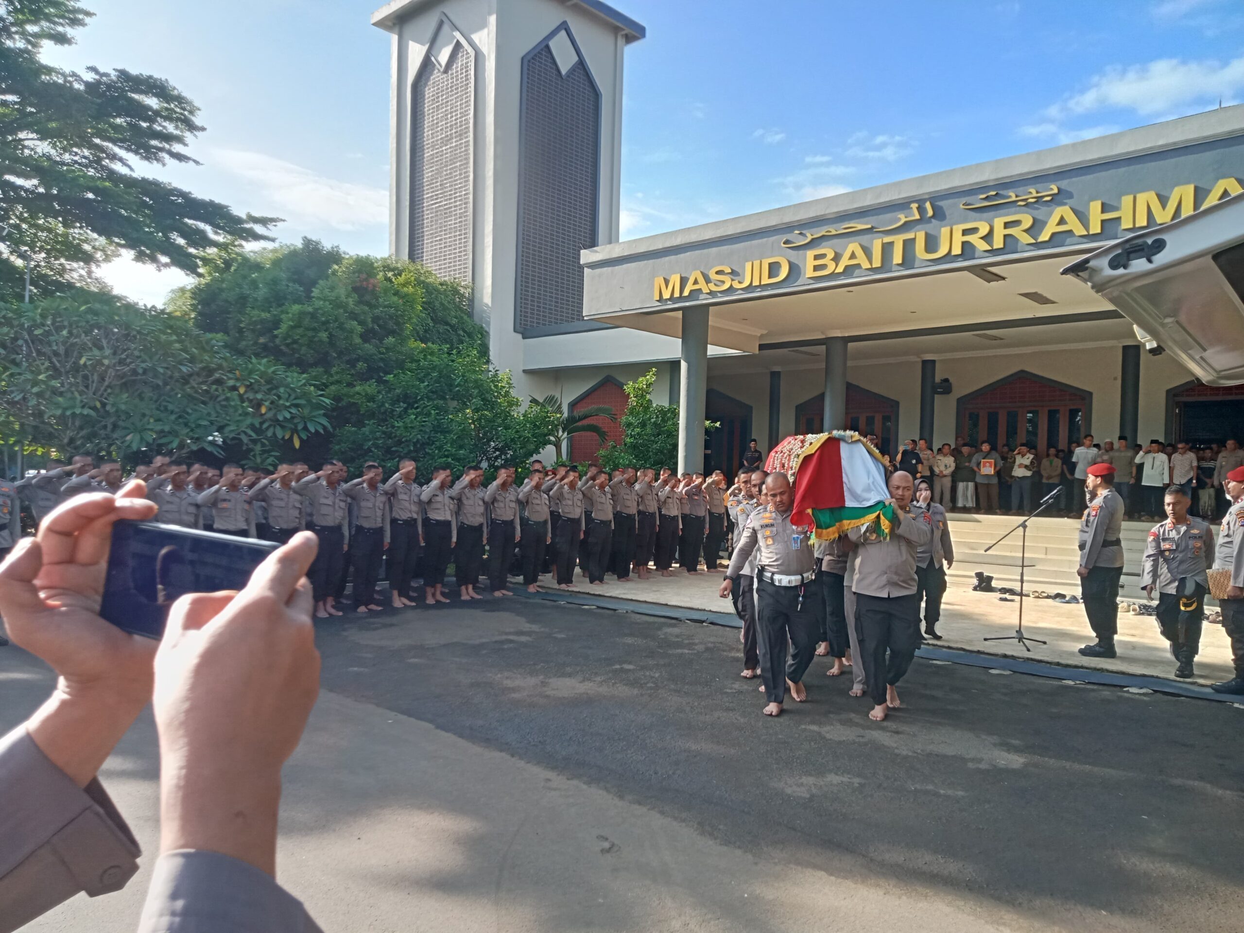 GERBANGPATRIOT.COM – Serang, Upacara pemberangkatan jenazah Almarhum Kabagdalopsnal Ditreskrimsus Polda Banten AKBP Edi Mulyono dipimpin oleh PS Kasubdit 5 Ditreskrimsus Polda Banten Kompol Rafles bertempat di masjid Baiturrahman Polda Banten pada Selasa (13/02).