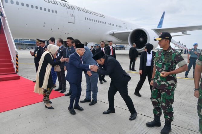 GERBANGPATRIOT.COM – Tangerang, Penjabat (Pj) Gubernur Banten Al Muktabar sambut kedatangan Wakil Presiden (Wapres) Ma’ruf Amin bersama Ibu Wury Ma’ruf Amin beserta rombongan dari Kunjungan Kenegaraan ke Selandia Baru dalam rangka diplomasi industri halal. Pesawat Kepresidenan GA-02 Boeing 777-300ER mendarat di Bandara Soekarno Hatta, Kota Tangerang pada pukul 14.40 WIB, Minggu (2/3/2024).