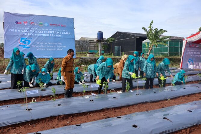 GERBANGPATRIOT.COM – Banten, Tim Penggerak Pemberdayaan dan Kesejahteraan Keluarga (TP-PKK) Provinsi Banten turut serta dalam Gerakan Tanam (Gertam) cabai pada rangkaian Hari Kesatuan Gerak PKK (HKG-PKK) ke-52. TP PKK Provinsi Banten bersama TP PKK Kabupaten/Kota se-Provinsi Banten melakukan penanaman sekitar 16.600 bibit cabai. Upaya menuju Provinsi Banten mandiri kebutuhan cabai.