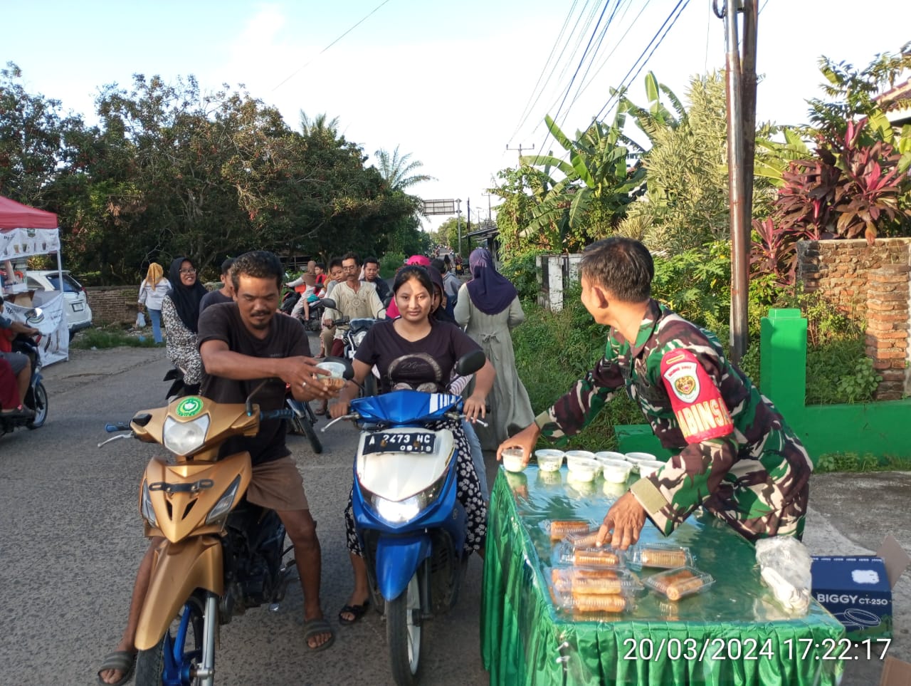 GERBANGPATRIOT.COM – Serang, Bintara Pembina Desa (Babinsa) Koramil 0602-09/Cikeusal Kodim 0602/Serang Sersan Satu (Sertu) Rahman Adibrata, melaksanakan kegiatan sosial dengan memberikan ratusan ta’jil gratis untuk berbuka puasa kepada warga, bertempat di depan Makoramil 0602-09/Cikeusal Kecamatan Cikeusal, Kabupaten Serang Provinsi Banten, Kamis (21/03/2024).