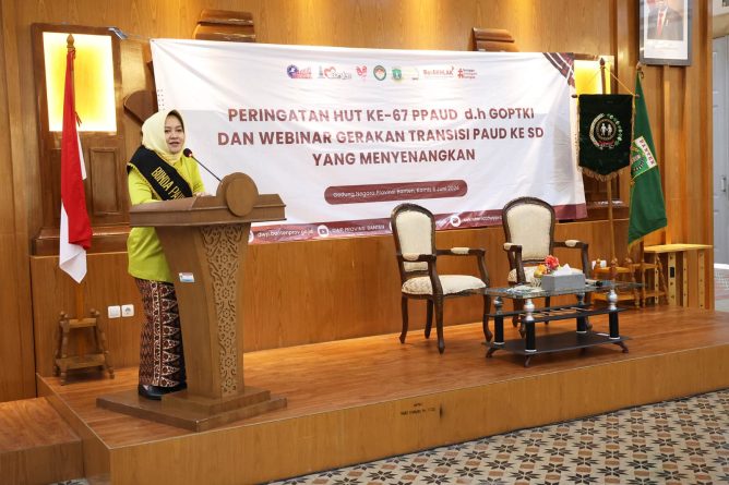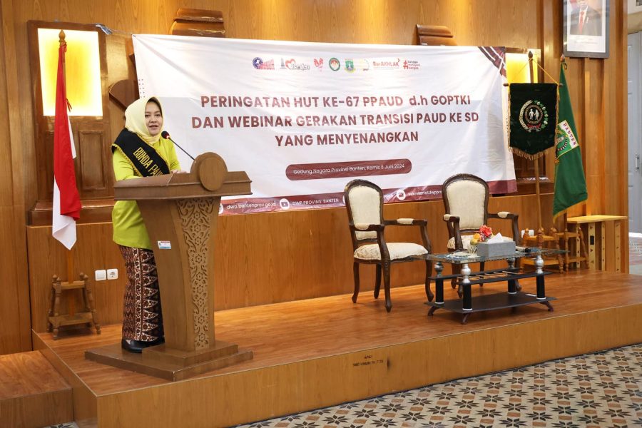GERBANGPATRIOT.COM – Serang, Bunda Paud Provinsi Banten Tine Al Muktabar sebut tujuan Pendidikan Anak Usia Dini (Paud) ciptakan anak sehat, cerdas, ceria dan berkarakter. “Saya mengajak penyelenggara Paud berorientasi tidak hanya aspek bisnis tapi juga mendidik anak sejak dini,” ungkap Tine Al Muktabar, pada Peringatan HUT ke-67 PP-Paud GOPTKI dan Webinar Gerakan Transisi Paud ke SD yang Menyenangkan di Gedung Negara Provinsi Banten Jl. Brigjen KH Syam’un No.5 Kota Serang, Kamis (6/6/2024).