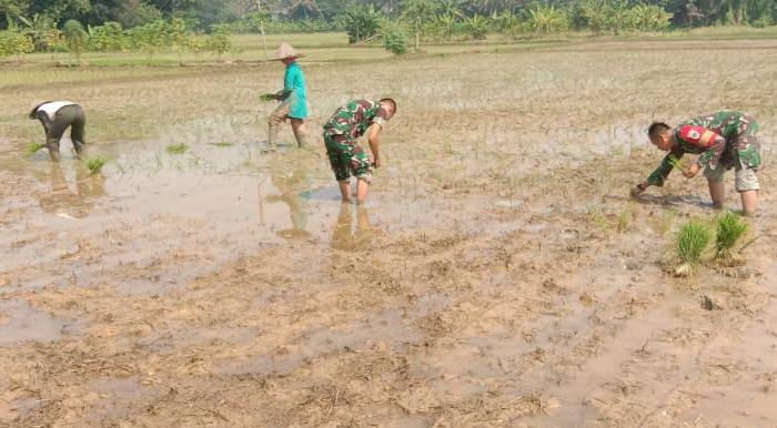 Dukung Ketahanan Pangan, Babinsa Koramil 0602-09/Cikeusal Membantu Petani Tanam Padi Di Desa Panasogan
