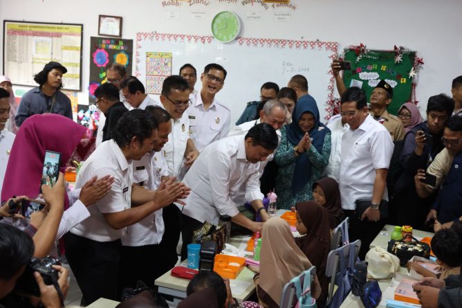 Di kesempatan ini, rombongan meninjau SD Negeri 4 dan 5 Sukasari Kota Tangerang yang disaksikan secara daring oleh seluruh sekolah yang terlibat pada uji coba program MBG.
