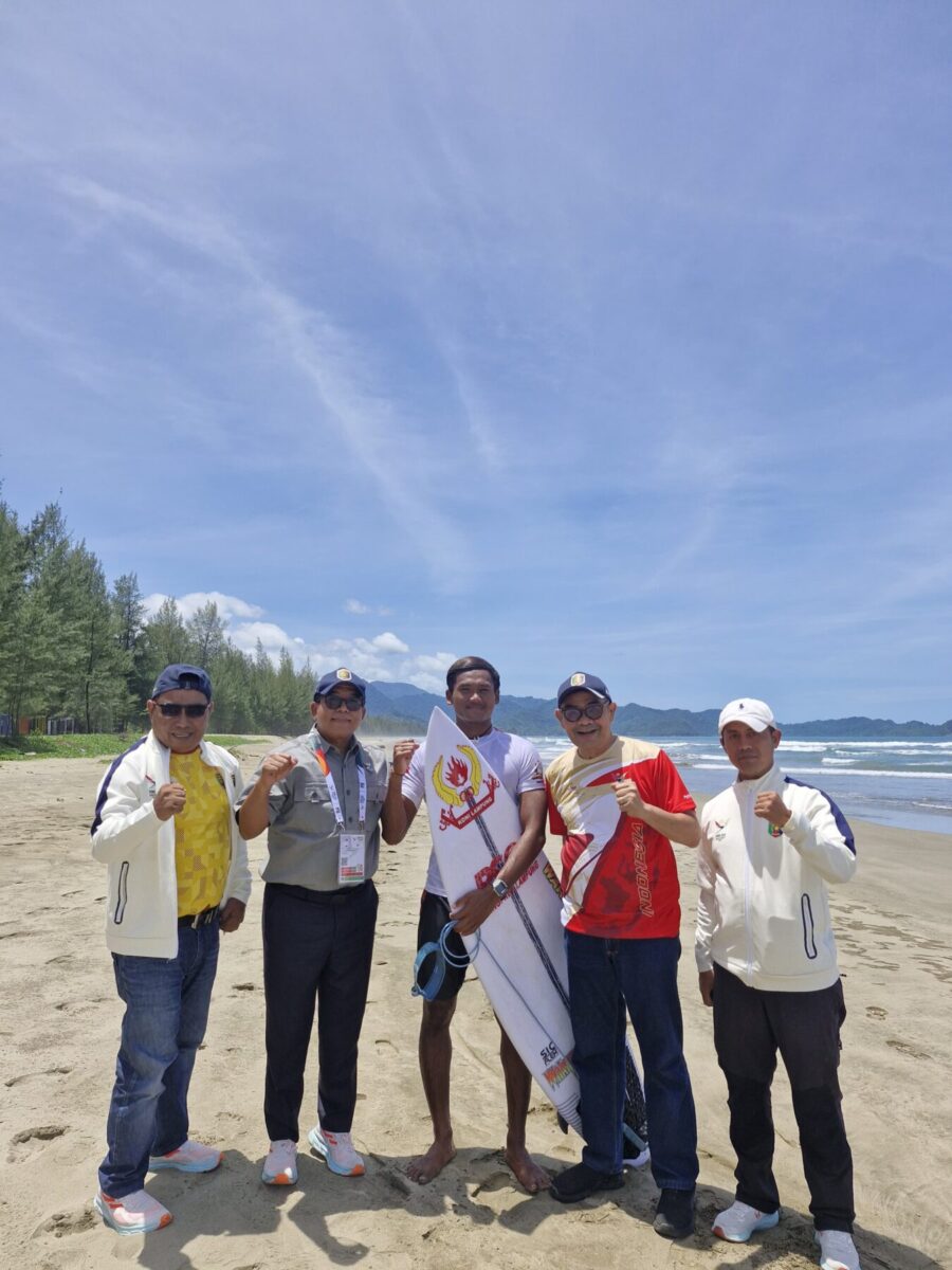 GERBANGPATRIOT.COM, Aceh – Pj. Gubernur Lampung Samsudin memberi semangat dan motivasi kepada empat atlet Lampung cabang olahraga selancar ombak saat berkunjung langsung ke venue cabang olahraga selancar ombak PON XXI 2024 di Pantai Babah Kuala Lhoknga/Pantai Riting, Kabupaten Aceh Besar, Provinsi Aceh, Selasa (10/9/2024).