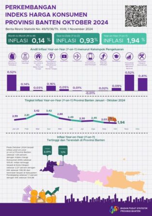 GERBANGPATRIOT.COM, Banten – Berdasarkan Berita Resmi Statistik Badan Pusat Statistik Provinsi Banten, Jumat (1/11/2024) yang dipaparkan oleh Kepala BPS Provinsi Banten Faizal Anwar, pada Oktober 2024 terjadi inflasi year on year (y-on-y) sebesar 1,94 persen dengan Indeks Harga Konsumen (IHK) sebesar 105,61. Inflasi bulan ke bulan (m-to-m) sebesar 0,14 persen, dan inflasi tahun kalender (year to date/ y-to-d) sebesar 0,93 persen.