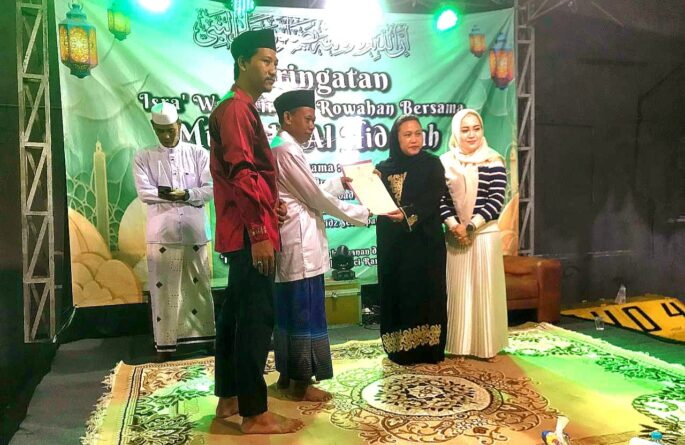 Penyerahan sertifikat tanah wakaf Musholla Al Hidayah dilakukan secara simbolis oleh Wakil Ketua Komisi 2 DPRD Kota Bekasi, Yenny Kristianti, SE, pada acara peringatan Isra dan Mi’raj Nabi Muhammad SAW 1446 H, yang diselenggarakan di RT 05, RW 04, tepatnya di kediaman Hendi Z. Arifin selaku Ketua RW 04.