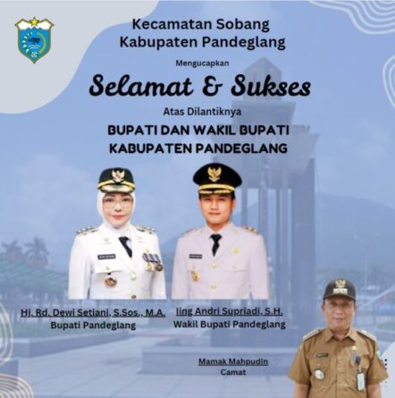 BANTEN Kecamatan Sobang Kabupaten Pandeglang Mengucapkan Selamat dan Sukses Atas Dilantiknya Hj. Rd. Dewi Setiani, S.Sos., M.A Sebagai Bupati Pandeglang dan Iing Andri Supriadi, S.H Sebagai Wakil Bupati Pandeglang Periode 2025-2030 20 Februari 2025 | 09:58 WIB25 Februari 2025 | 10:06 WIB admin
