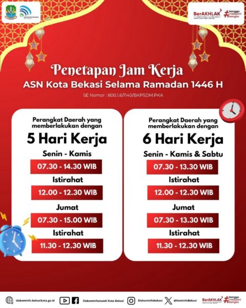 GERBANGPATRIOT.COM, Kota Bekasi – Berdasarkan Peraturan Presiden Republik Indonesia Nomor 21 Tahun 2023 tentang Hari Kerja dan Jam Kerja Instansi Pemerintah dan Pegawai Aparatur Sipil Negara, Pemerintah Kota Bekasi melalui Badan Kepegawaian dan Pengembangan Sumber Daya Manusia (BKPSDM) mengeluarkan Surat Edaran Nomor : 800.1.6/1140/BKPSDM.PKA tentang penetapan jam kerja pada bulan Ramadhan 1446 Hijriah bagi aparatur pemerintah Kota Bekasi