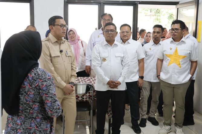 Usai meninjau gedung workshop, Andra Soni bersama Menteri P2MI Abdul Kadir Karding dan rombongan meninjau asrama bagi para peserta pelatihan yang tidak jauh dari lokasi. (Sya)