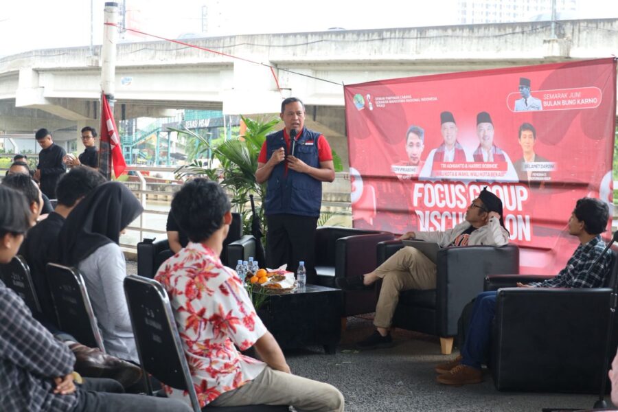 GERBANGPATRIOT.COM, Kota Bekasi – Suasana berbeda terlihat di bawah Flyover Kalimalang, Wali Kota Bekasi Tri Adhianto hadir dalam diskusi santai bersama kader Gerakan Mahasiswa Nasional Indonesia (GMNI) Kota Bekasi dalam rangka memperingati Bulan Bung Karno. Forum diskusi yang dibuka secara terbuka ini diinisiasi sebagai bagian dari upaya menghidupkan kembali ruang publik dan memperkuat semangat kebangsaan di tengah masyarakat urban.
