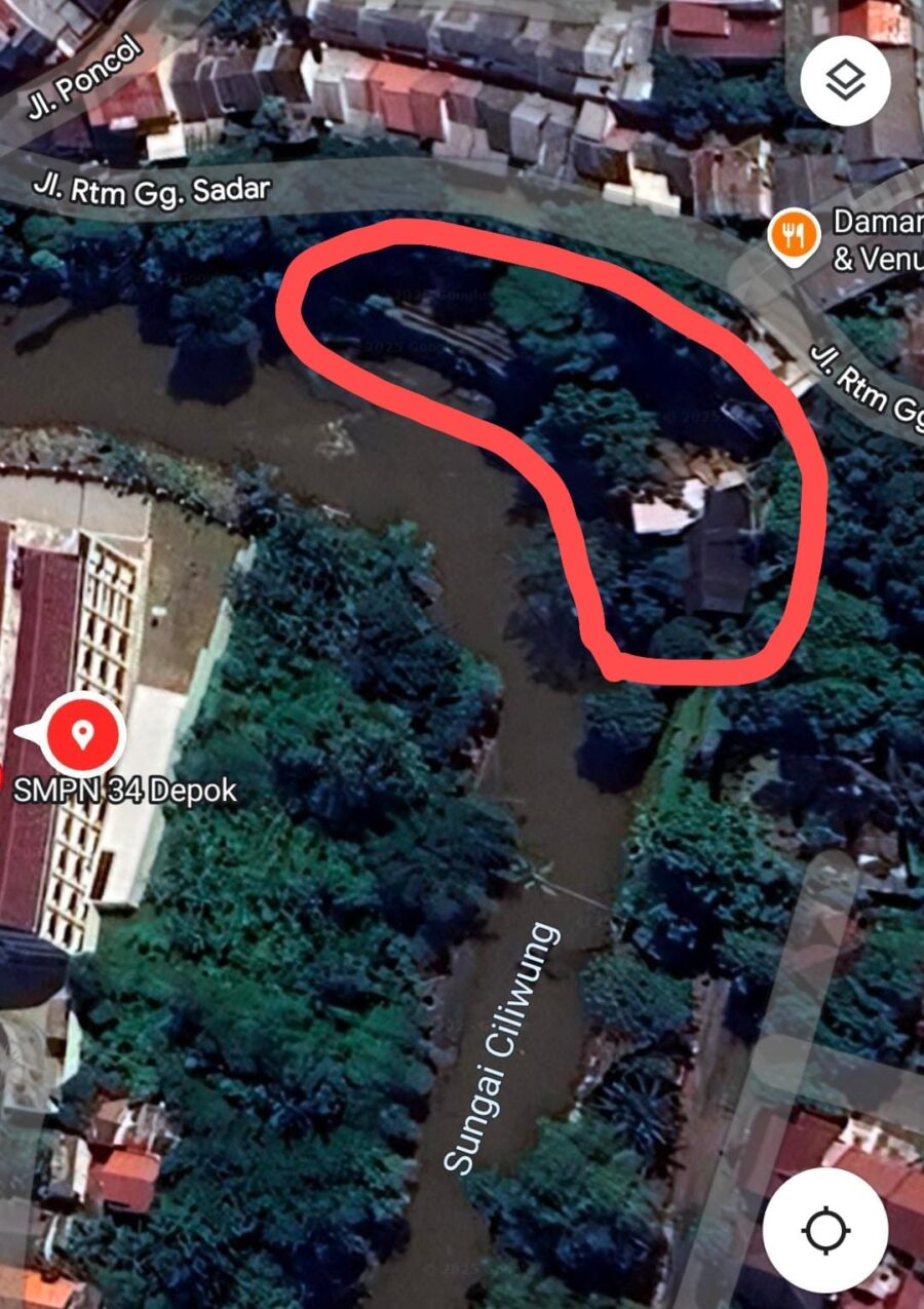 GERBANGPATRIOT.COM, Depok – Bahwa telah terjadi indikasi pelanggaran peruntukan tata ruang atas pembangunan bangunan fisik di Jalan Sadar Kelapa Dua RT 08/10 Kel Tugu Kec Cimanggis Kota Depok, tepatnya di area badan Sungai Ciliwung dengan koordinat 6°21’41″S 106°50’23″E. Di mana terjadi perubahan bentang alam dan kontur serta peruntukan lahan yang sesungguhnya merupakan badan air Sungai Ciliwung. Badan air berikut dengan sempadan Sungai Ciliwung memiliki fungsi sebagai kawasan konservasi air Sungai Ciliwung. Namun telah dialihfungsikan area seluas 1.717 m2 tersebut dengan dibangun menjadi bangunan yang secara fisik berupa rumah dan berbagai perkerasan beton dan semen.