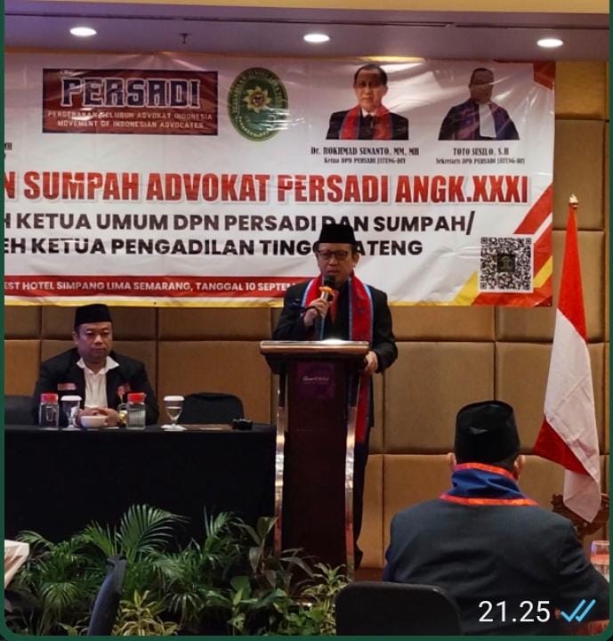 GERBANGPATRIOT.COM, Semarang – Ketua DPD Persadi Jateng-DIY, Irjen Pol (Purn) Dr. Rokhmad Sunanto, MM, MH, CRM yang mewakili Ketua Umum Dewan Pimpinan Nasional (DPN) Persadi, Syam Daeng Rani, SH, memimpin Pelantikan dan Sumpah Advokat Persadi Angkatan XXXI, bertempat di Quest Hotel Semarang, Rabu (10 September 2025).