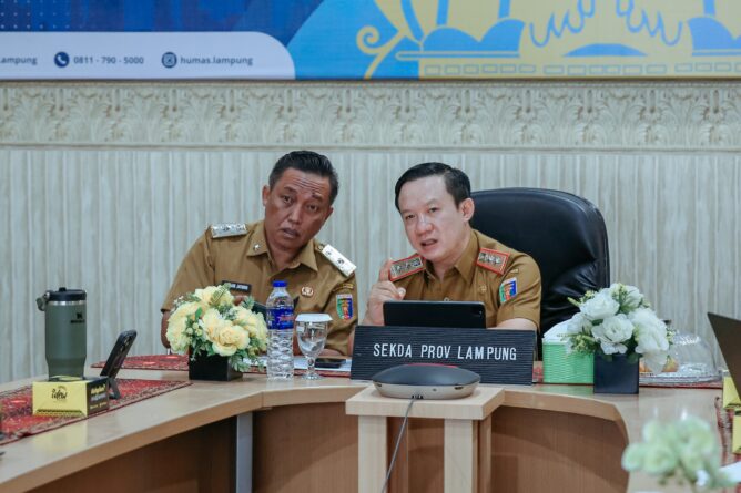 GERBANGPATRIOT.COM, Bandar Lampung – Sekretaris Daerah Provinsi Lampung Marindo Kurniawan bersama sejumlah kepala perangkat daerah terkait dan unsur Forum Komunikasi Pimpinan Daerah (Forkopimda) Provinsi Lampung, mengikuti rapat Koordinasi Pengendalian Inflasi Daerah Tahun 2025 yang dipimpin oleh Mendagri Tito Karnavian secara virtual dari Ruang Command Center Dinas Kominfotik Provinsi Lampung, Selasa (16/9/2025).