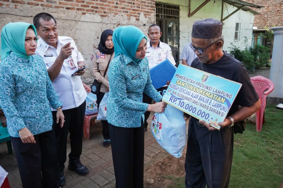 GERBANGPATRIOT.COM, Bandar Lampung – Pemerintah Provinsi Lampung melalui Dinas Sosial menyerahkan bantuan dana santunan kematian kepada keluarga korban bencana di Jalan AMD Tumenggung, Gang turunan RT 04 LK 2 Kelurahan Gunung Sulah, Kecamatan Way Halim, Rabu (24/09/2025).