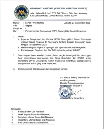 GERBANGPATRIOT.COM, Gunungkidul – Ketua DPC Partai Gerindra Gunungkidul Purwanto ST memimpin inspeksi mendadak ke dua Satuan Pelayanan Pemenuhan Gizi (SPPG) di Semin dan Karangmojo, Rabu (8/10/2025).