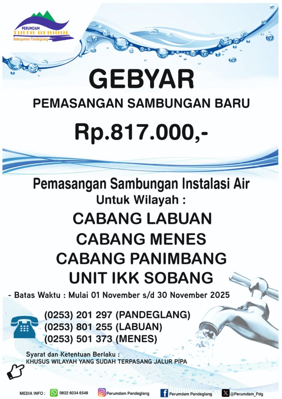 GERBANGPATRIOT.COM, Pandeglang – Perusahaan Umum Daerah Air Minum (Perumdam) Tirta Berkah Kabupaten Pandeglang, menghadirkan program gebyar promosi pemasangan sambungan baru yang berlangsung selama periode 1 November, hingga 30 November 2025.