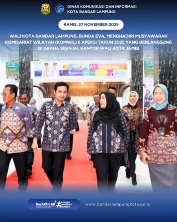 GERBANGPATRIOT.COM, Jambi — Wali Kota Bandar Lampung, Hj. Eva Dwiana, menghadiri Musyawarah Komisariat Wilayah (MUSKOMWIL) II Asosiasi Pemerintah Kota Seluruh Indonesia (APEKSI) Tahun 2025 Se-Sumatera Bagian Selatan (Sumbagsel) yang digelar di Graha Siginjai, Kantor Wali Kota Jambi, pada Kamis (27/11/2025).