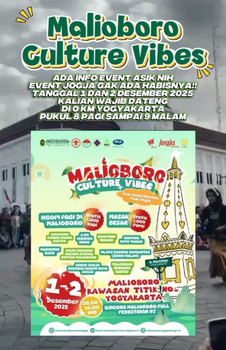 GERBANGPATRIOT.COM, Jogja – Pemerintah Kota Yogyakarta akan menggelar Malioboro Culture Vibes 2025 pada 1–2 Desember 2025 sebagai langkah konkret menciptakan wajah baru Malioboro yang tertib, nyaman, dan aman sebagai ruang publik budaya.