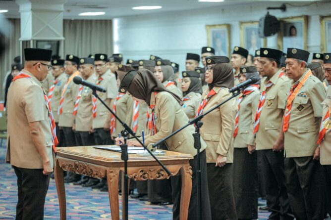 GERBANGPATRIOT.COM, Bandar Lampung – Gubernur Lampung Rahmat Mirzani Djausal selaku Ketua Mabida Gerakan Pramuka Kwarda Lampung melantik Jihan Nurlela sebagai Ketua Kwarda Lampung dan pengurus Kwarda Pramuka Lampung periode 2025-2030, di Balai Keratun, Komplek Dinas Kantor Gubernur, Bandarlampung, Senin (1/12/2025).
