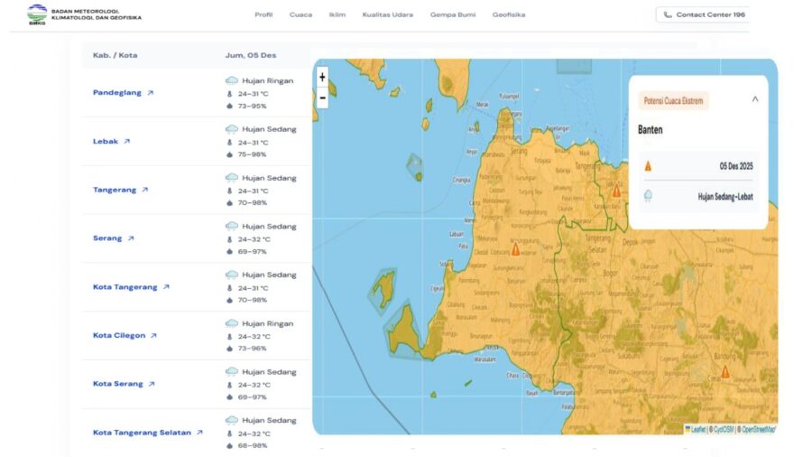 “BMKG telah memperbarui prakiraan cuaca untuk wilayah Provinsi Banten. Pada pagi hari, cuaca diprakirakan didominasi cerah berawan, dengan potensi hujan ringan di wilayah Sumur, Cibeber, dan Cijaku. Memasuki siang hari, kondisi berawan hingga hujan ringan berpotensi terjadi, serta hujan sedang di beberapa wilayah seperti Padarincang, Ciomas, Pabuaran, Petir, Jawilan, Solear, Jambe, Panongan, Legok, Pagedangan, Cisauk, Tigaraksa, Serpong, Ciputat, Mandalawangi, Cadasari, Pandeglang, Maja, Curugbitung, Sajira, Cipanas, Sobang, dan Cibeber. Selain itu, BMKG juga mengingatkan adanya potensi hujan sedang hingga lebat yang dapat disertai kilat atau petir serta angin kencang di wilayah Kabupaten Serang bagian Selatan, Kabupaten Tangerang bagian Selatan, Kota Tangerang Selatan, Kabupaten Pandeglang bagian Utara, dan Kabupaten Lebak bagian Timur,” jelas Meryadi.