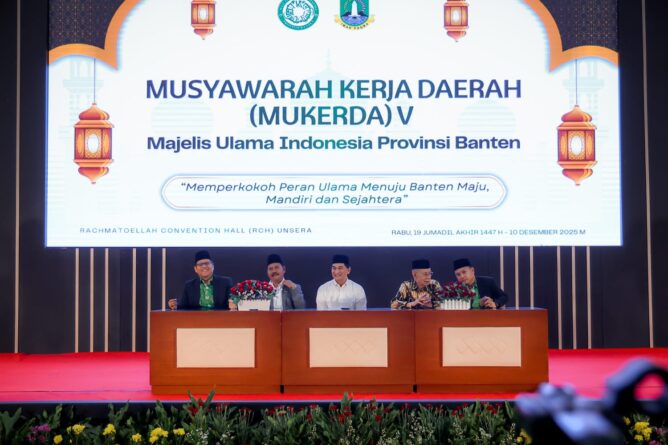 GERBANGPATRIOT.COM, Kota Serang – Wakil Gubernur Banten Achmad Dimyati Natakusumah menegaskan pentingnya peran ulama dan kiai dalam pembangunan Sumber Daya Manusia (SDM) yang unggul, berdaya saing, dan berakhlak mulia di Provinsi Banten. Penegasan ini disampaikan saat memberikan arahan pada Musyawarah Kerja Daerah (Mukerda) ke-V Majelis Ulama Indonesia (MUI) Provinsi Banten di Ballroom Universitas Serang Raya (Unsera), Kota Serang, Rabu (10/12/2025).