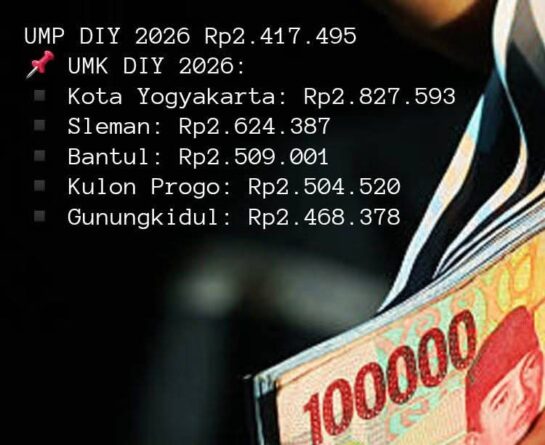 Melalui Keputusan Gubernur DIY Nomor 443 Tahun 2025, UMK Kota Yogyakarta resmi ditetapkan sebesar Rp2.827.593 dan mulai berlaku efektif per 1 Januari 2026.