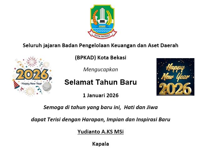 Iklan Seluruh jajaran Badan Pengelolaan Keuangan dan Aset Daerah (BPKAD) Kota Bekasi Mengucapkan Selamat Tahun Baru 1 Januari 2026 25 Desember 2025 | 01:43 WIB Admin