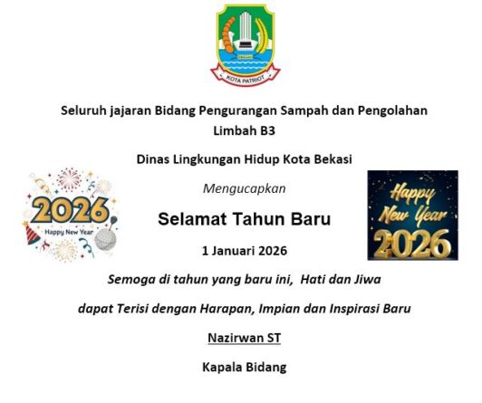 Iklan Seluruh jajaran Bidang Pengurangan Sampah dan Pengolahan Limbah B3 Dinas Lingkungan Hidup Kota Bekasi Mengucapkan Selamat Tahun Baru 1 Januari 2026 25 Desember 2025 | 01:38 WIB Admin