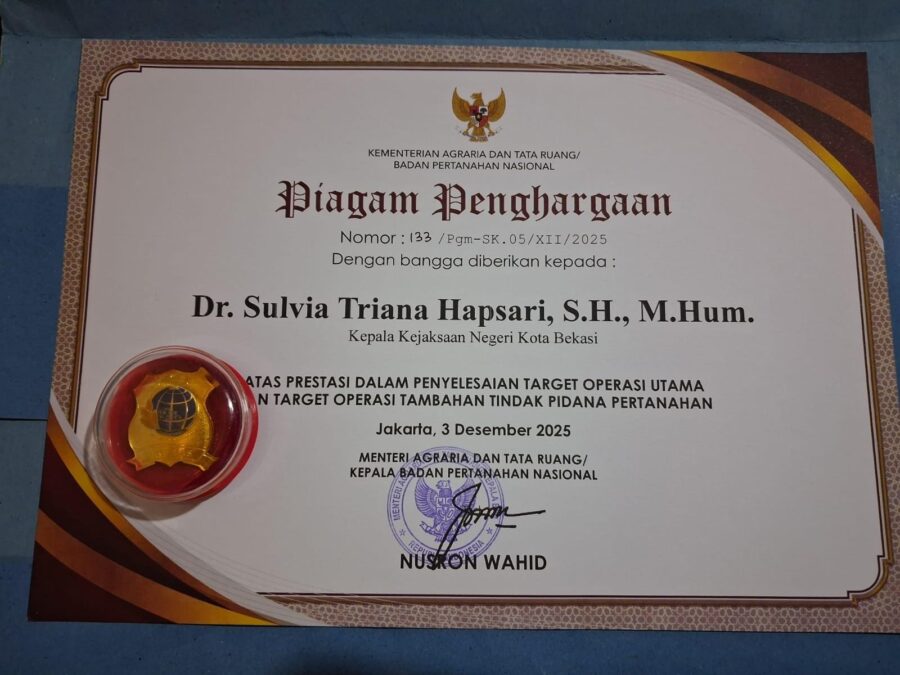 Kejari Kota Bekasi menerima Penghargaan dan Pin Emas dari Menteri ATR/BPN atas keberhasilan dalam penyelesaian Target Operasi Utama dan Target Operasi Tambahan Tindak Pidana Pertanahan. Penghargaan ini menegaskan peran aktif Kejari Kota Bekasi dalam mendukung kebijakan nasional pemberantasan mafia tanah serta penyelesaian perkara pertanahan secara cepat, tepat, dan berkeadilan.