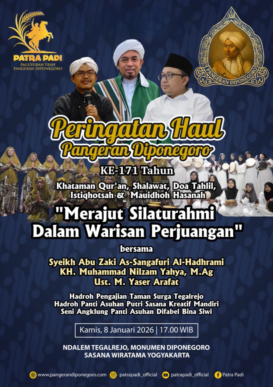 GERBANGPATRIOT.COM, Jogja – Paguyuban Trah Pangeran Diponegoro (Patra Padi) menggelar Peringatan Haul Bendoro Pangeran Haryo (BPH) Diponegoro ke-171 tahun di nDalem Tegalrejo, Monumen Diponegoro, Yogyakarta, Kamis Kliwon (8/1/2026).