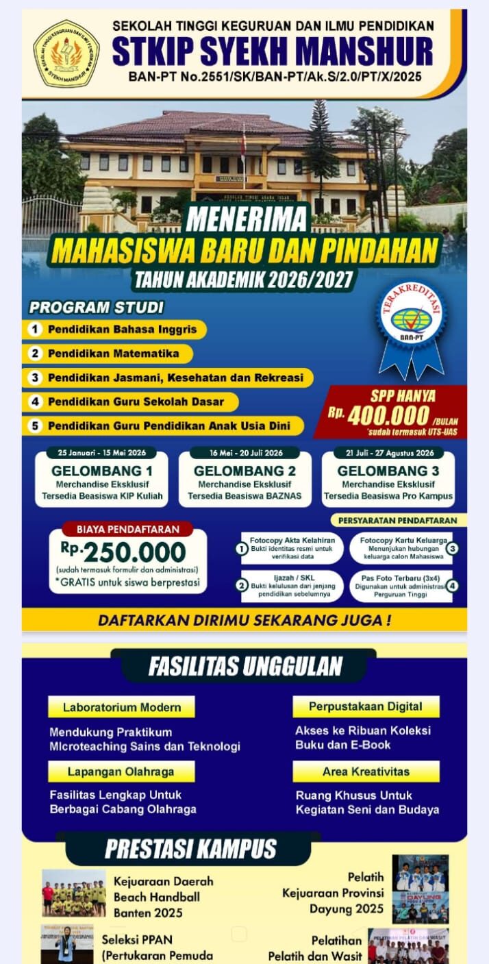 GERBANGPATRIOT.COM, Pandeglang — Sekolah Tinggi Keguruan dan Ilmu Pendidikan (STKIP) Syekh Manshur kembali membuka penerimaan mahasiswa baru dan mahasiswa pindahan untuk Tahun Akademik 2026/2027. Pendaftaran dibuka mulai 25 Januari hingga 27 Agustus 2026 dan dilaksanakan dalam tiga gelombang.
