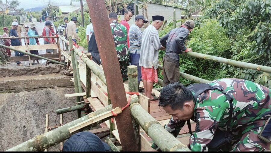 Danramil 0105 Mandalawangi Bersama Warga Bangun Jembatan Darurat di Desa Sinarjaya