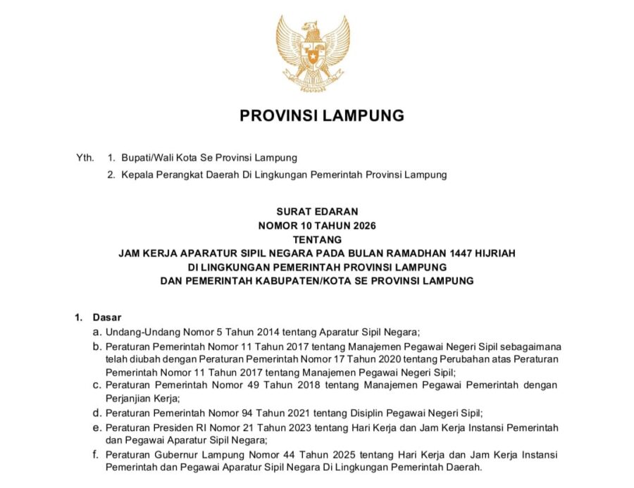 GERBANGPATRIOT.COM, Bandar Lampung — Pemerintah Provinsi Lampung resmi menetapkan penyesuaian jam kerja bagi Aparatur Sipil Negara (ASN) selama bulan Ramadhan 1447 Hijriah. Kebijakan tersebut tertuang dalam Surat Edaran (SE) Nomor 10 Tahun 2026 yang ditandatangani Sekretaris Daerah Provinsi Lampung, Malindo Kurniawan, pada 13 Februari 2026.