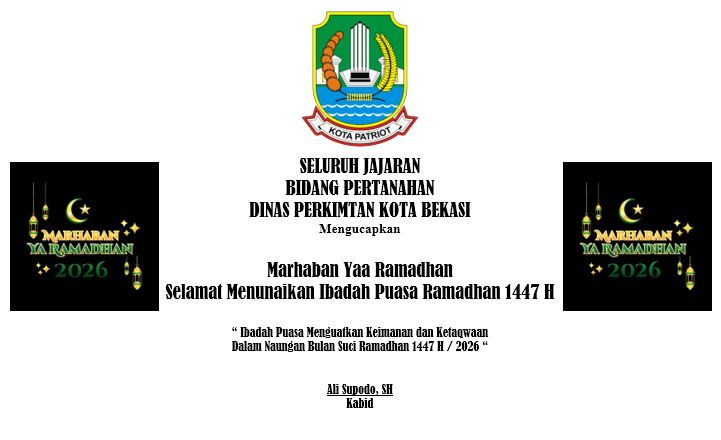 Iklan SELURUH JAJARAN BIDANG PERTANAHAN DINAS PERKIMTAN KOTA BEKASI Mengucapkan Selamat Menunaikan Ibadah Puasa Ramadhan 1447 H 19 Februari 2026 | 00:51 WIB Admin