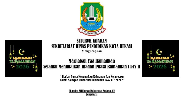 Iklan SELURUH JAJARAN SEKRETARIAT DINAS PENDIDIKAN KOTA BEKASI Mengucapkan Selamat Menunaikan Ibadah Puasa Ramadhan 1447 H 19 Februari 2026 | 00:50 WIB Admin