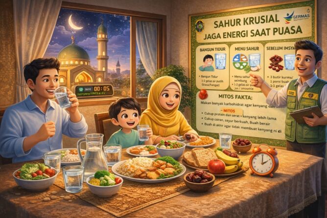 GERBANGPATRIOT.COM, YOGYAKARTA – Dinas Kesehatan Kota Yogyakarta menegaskan pentingnya sahur sebagai penentu kondisi tubuh selama menjalankan ibadah puasa. Melalui infografis edukasi yang dirilis pekan ini, Dinkes menyebut waktu sahur sebagai momen krusial untuk menjaga energi dan mencegah dehidrasi.