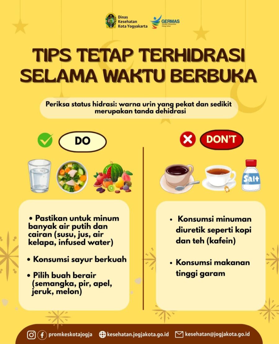 GERBANGPATRIOT.COM, YOGYAKARTA — Dinas Kesehatan Kota Yogyakarta mengimbau masyarakat untuk menjaga asupan cairan tubuh selama waktu berbuka puasa guna mencegah dehidrasi selama Ramadan. Imbauan tersebut disampaikan melalui kampanye Gerakan Masyarakat Hidup Sehat (GERMAS) yang digencarkan kepada publik.