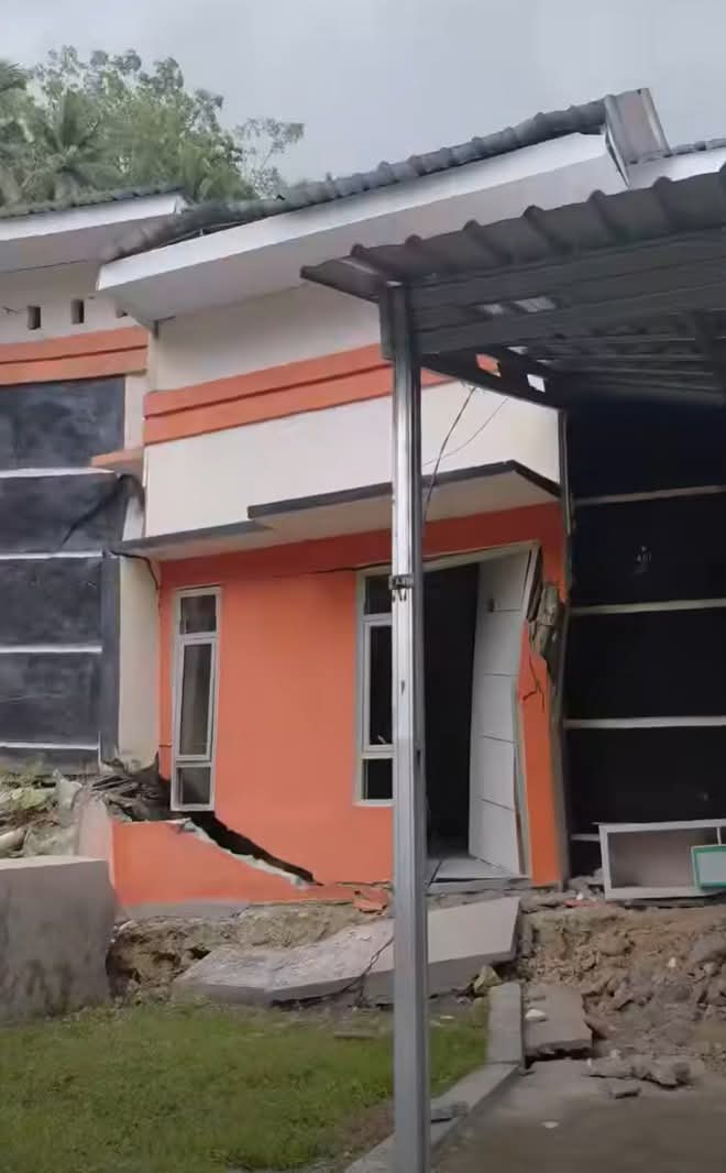 Kondisi tanah yang labil dan jenuh air diduga menyebabkan tanah terkikis dan mengalami penurunan hingga sekitar 2,5 meter di salah satu rumah warga.