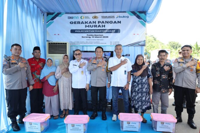 GERBANGPATRIOT.COM, Serang – Wakapolda Banten Brigjen Pol. Dr. Hendra Wirawan didampingi Dirbinmas Polda Banten Kombes Pol. Imam Tarmudi serta sejumlah Pejabat Utama Polda Banten meninjau langsung pelaksanaan Gerakan Pangan Murah Polri yang digelar secara serentak di wilayah Banten pada Jumat (13/03/2026).